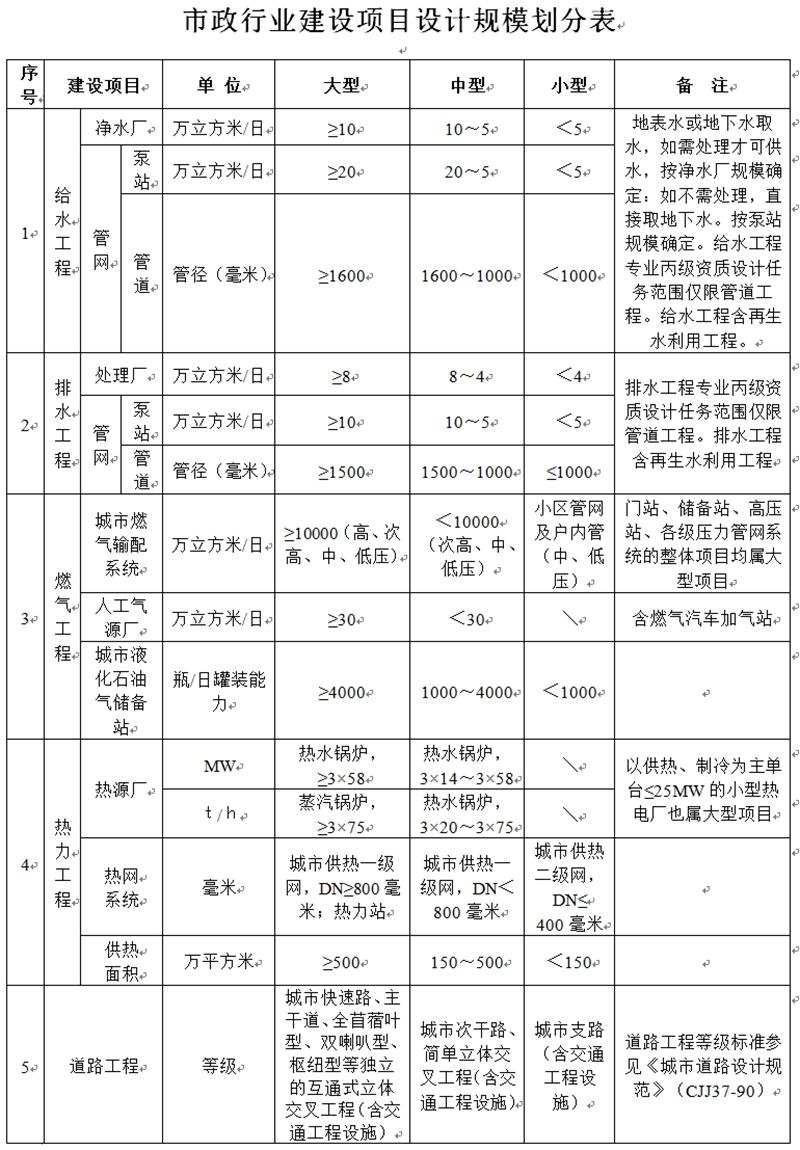 市政行業(yè)建設(shè)項(xiàng)目設(shè)計(jì)規(guī)模劃分表