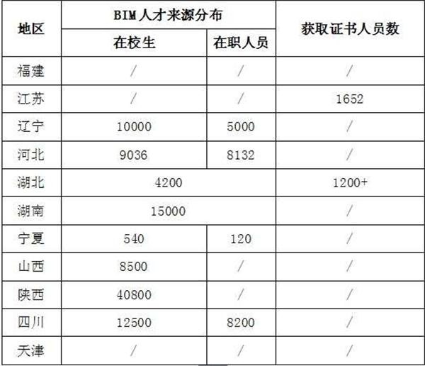 1、來(lái)源分布。11個(gè)省市提供的數(shù)據(jù)表明,BIM人才主要來(lái)源于在校學(xué)生,以及接受BIM相關(guān)培訓(xùn)的企業(yè)在崗人員,詳見(jiàn)表所示。